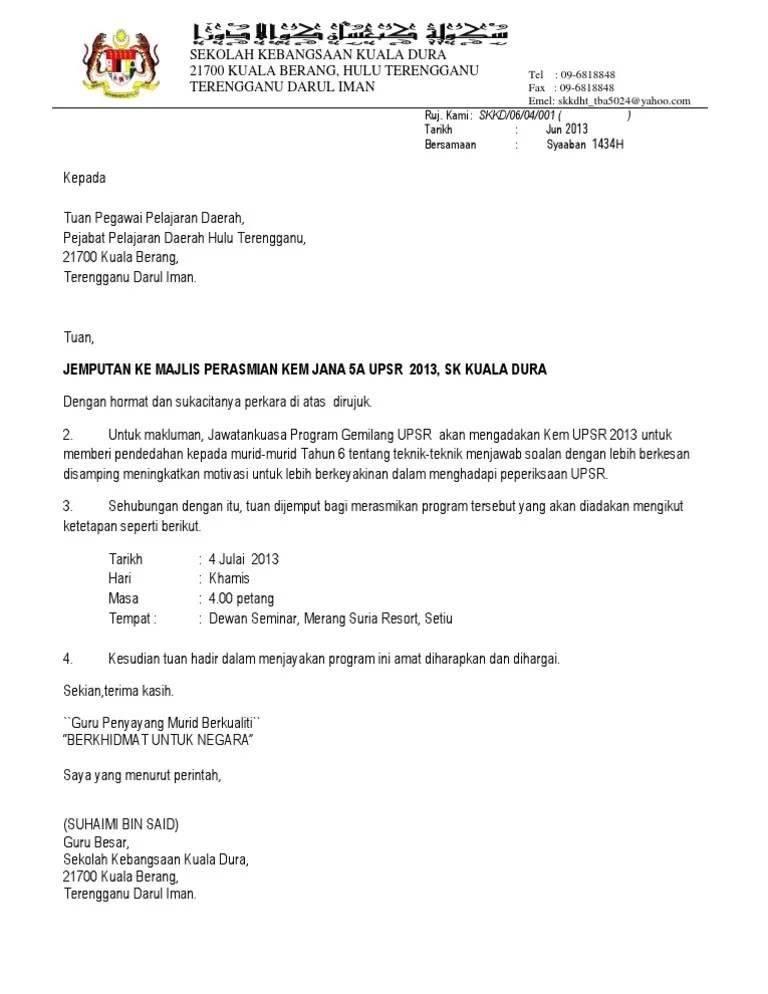 Contoh surat rasmi jemputan merasmikan majlis. 4.0 sehubungan itu, pihak pengelola karnival berharap tuan dapat menghadiri majlis ini dan seterusnya merasmikan. Surat rasmi jemputan mesyuarat resepi book b . Surat jemputan perasmi mesyuarat agung 2011 14. Jemputan kepada perasmi hendaklah menggunakan surat rasmi. Menutup rasmi kejohanan sukan sekolah sk lktp air tawar 4. Surat jemputan terbuka untuk menyertai majlis gabungan flotilla 2 arakan. Hj mustafa bin majid, timbalan pegawai pendidikan daerah) tuan, jemputan sebagai perasmi majlis anugerah cemerlang 2016 sekolah kebangsaan seri . Contoh surat jemputan perasmian penutupan perkhemahan. Dato' seri didahului dengan ucapan ribuan . Contoh surat rasmi jemputan yb. Dato akan lebih memeriahkan lagi kejohanan tersebut. Jemputan sebagai perasmi majlis perasmian penutup kejohanansukan sekolah sk lktp air tawar 4.